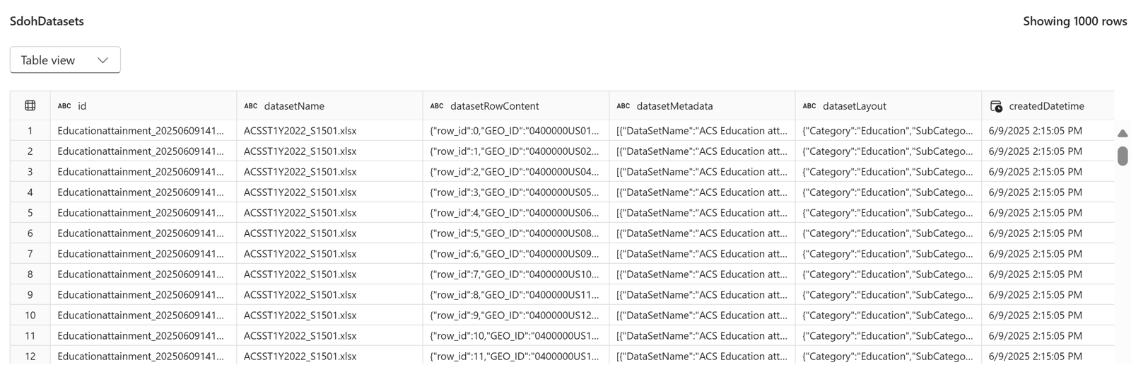 عند إعداد مجموعات البيانات الأولية للاستيعاب، يقوم النظام بإعداد مجموعة موحدة من بيانات التعريف التي تسمح لمنطق مسار الاستيعاب لاستيعاب مجموعة بيانات SDOH الخاصة بك في OneLake. تتضمن بيانات التعريف المطلوبة التخطيط، وتكوين الموقع، وDatasetMetadata. عند استخدام تنسيق CSV، يوفر النظام بيانات التعريف كملفات CSV منفصلة. عند استخدام تنسيق XLSX، تكون بيانات التعريف أوراق عمل منفصلة في ملف XLSX.