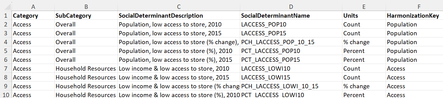 HarmonizationKey - يحتوي هذا العمود على قيمة مهمة يجب مراعاتها لأنه يسمح لك باستخدام مفتاح شائع لوصف أنواع مماثلة من البيانات عبر الناشرين. تتيح لك هذه القيمة تحديد المقاييس ذات الصلة والاستعلام عنها واستخدامها لإثراء بيانات الرعاية الصحية الخاصة بك بغض النظر عن ناشر مجموعة بيانات SDOH.