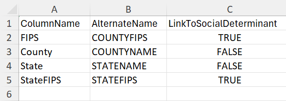 التخطيط - حدد مقاييس SDOH المختصرة، بما في ذلك اسم المحدد الاجتماعي والوصف والوحدة والفئات. جميع الأعمدة مطلوبة لوصف التخطيط. تحتاج فقط إلى تعريف الأعمدة من أوراق عمل البيانات التي تحتوي على المقاييس التي تستخدمها. على سبيل المثال، لا تقوم بتعريف المدينة أو الولاية في التخطيط؛ يجب عليك تعريفها في تكوين الموقع.