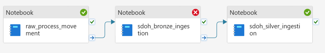 مع وضع الملفات في بنية مجلد Ingest ، يمكنك تشغيل msft_sdoh_pipeline لاستيعاب البيانات. يحول هذا المسار البيانات من مستودع البرونز إلى مستودع الفضة.