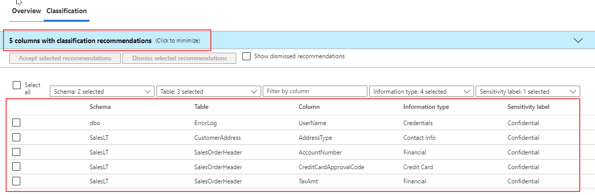 في المثال، هناك خمسة أعمدة موصى بها للتصنيف. تبدو خصائص نوع المعلوماتوتسمية الحساسية متسقة مع اسم العمود والغرض العام. ومع ذلك، نظرا لأن التوصيات تستند إلى اسم العمود، فلن يوصى باستخدام عمود يسمى column1 يحتوي على عناوين بريد إلكتروني كمعلومات شخصية حساسة.