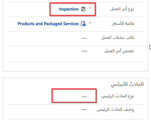 يكون نوع أمر العمل مطلوبًا عِند إنشَاء أمر عمل، ولكن نوع الحدث ليس حقلاً مطلوبًا فِي أمر العمل. يمكنك التغيير عِند تحديد نوع أمر العمل مِن خلال تعيين الحدث المطلوب إلى نعم فِي نموذج نوع أمر العمل.
