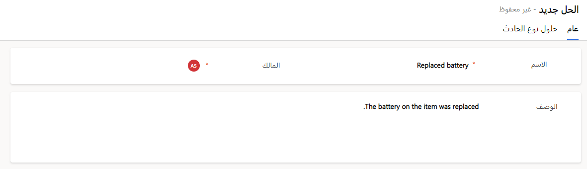 يمكنك تعيين الحلول فِي أمر العمل أو اقرَانهَا بأنوَاع الحوَادث. يمكن لأحد الفنيين أن يقوم بوضع علامة عَلى حل وَاحد أو أكثر فِي أمر العمل.