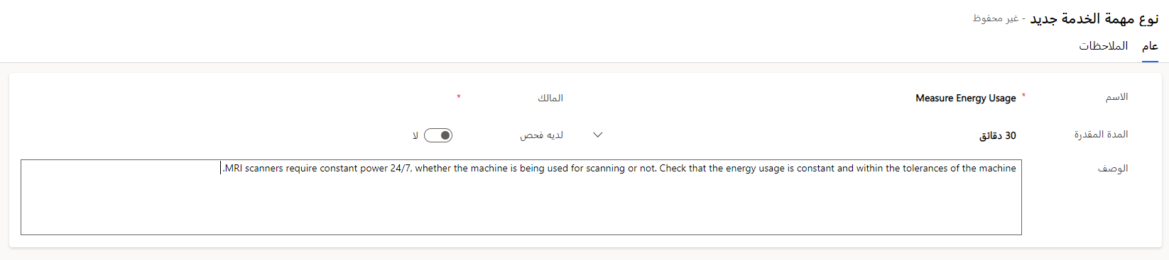 وبمجرد إنشَاء أنوَاع مهَام الخدمة، يمكن الرجوع إليهَا مِن خلال العديد مِن الحوَادث وأوَامر العمل. عَلى سبيل المثَال، إذَا كَان كل أمر عمل يتطلب مِن الفني جمع توقيع العملاء، فِيمكنك تحديد نوع مُهِمٌة خدمة جمع توقيع العملاء مرة وَاحدة، وإضافته عِند الحَاجة.