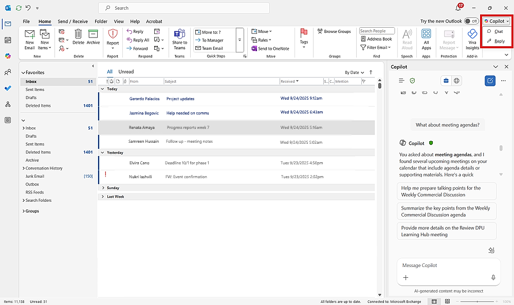- افتح Outlook وحدد Copilot Chat من الشريط.