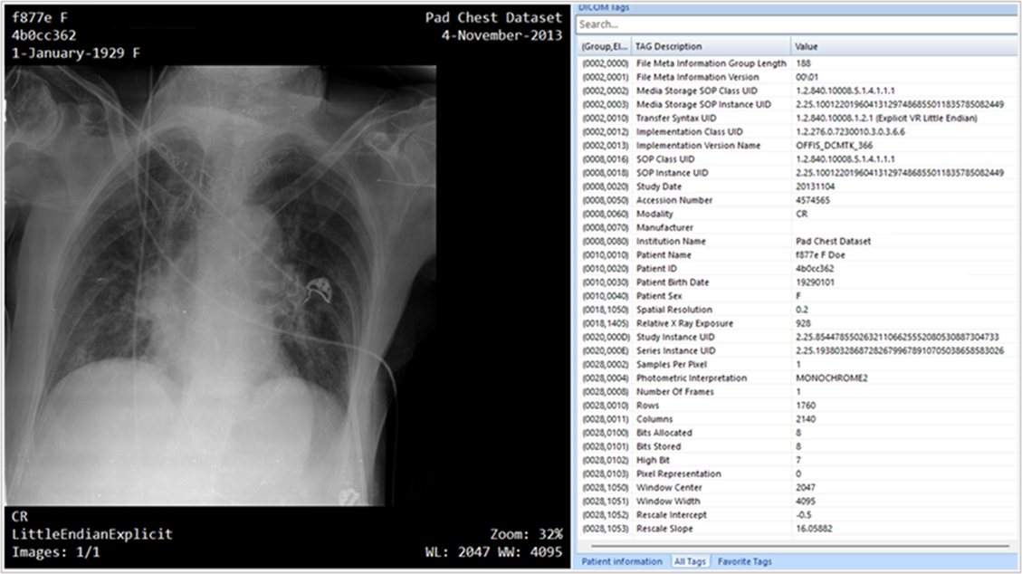 تعمل DICOM® على تحويل بيانات التصوير الطبي إلى بيانات منظمة قابلة للاستخدام، وفتح مستودعات البيانات، والسماح بالتشغيل التفاعلي بين الأنظمة المتوافقة. لقطة الشاشة التالية هي مثال على بيانات التصوير.
