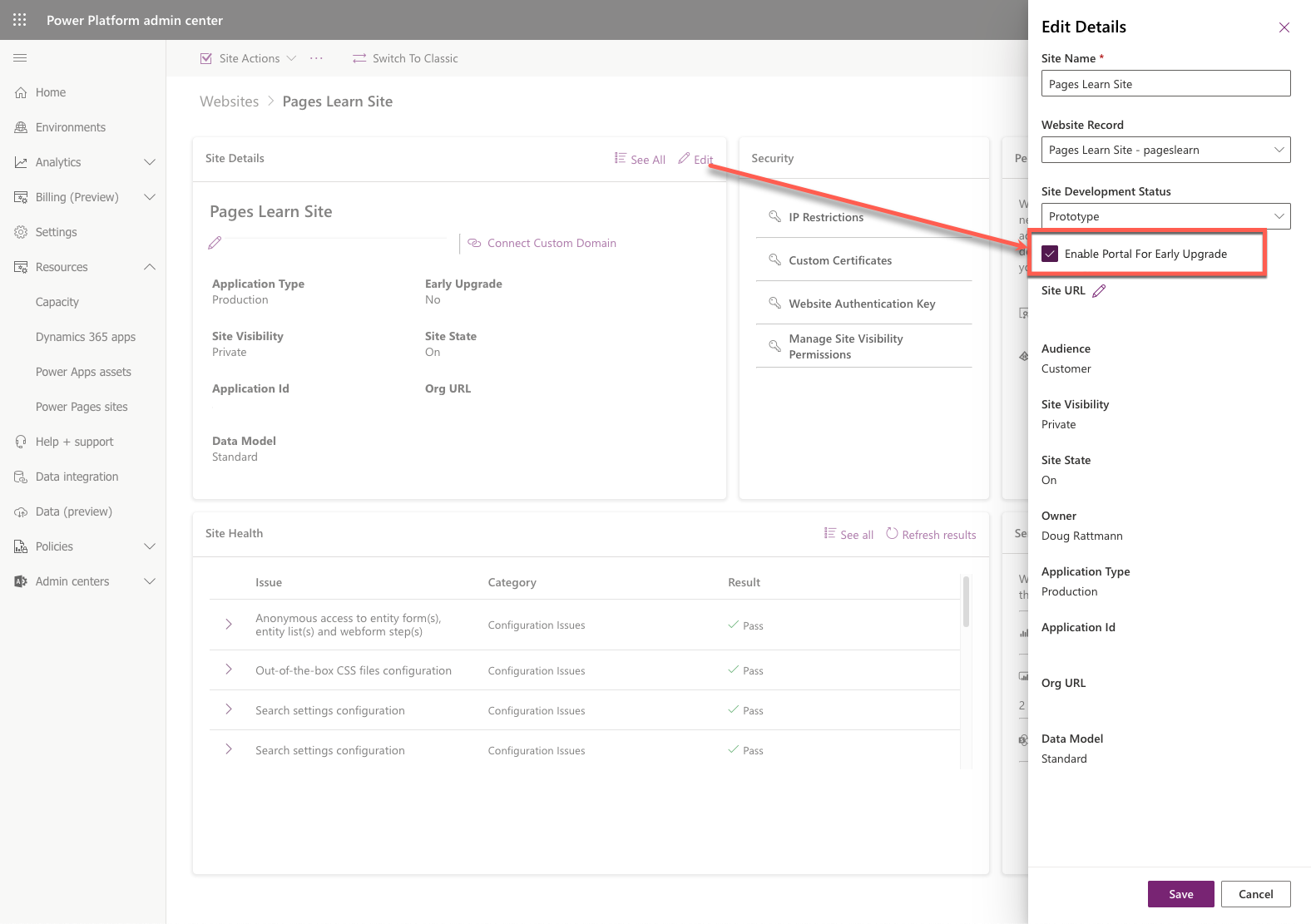 يمكن للمسؤول أيضاً اختيار تلقي التحديثات المبكرة فِي مداخل مركز مسؤول Power Pages.