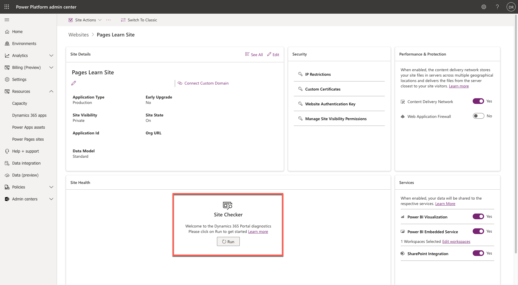 تتوفر ميزة مدقق الموقع فِي مركز إدارة Power Pages وتقوم بإجراء فحوصات تشخيصية لحماية وتقديم المشورة بشأن المشكلات الشائعة التي قد تتم مواجهتها عند تشغيل الأشخاص لموقع ويب.