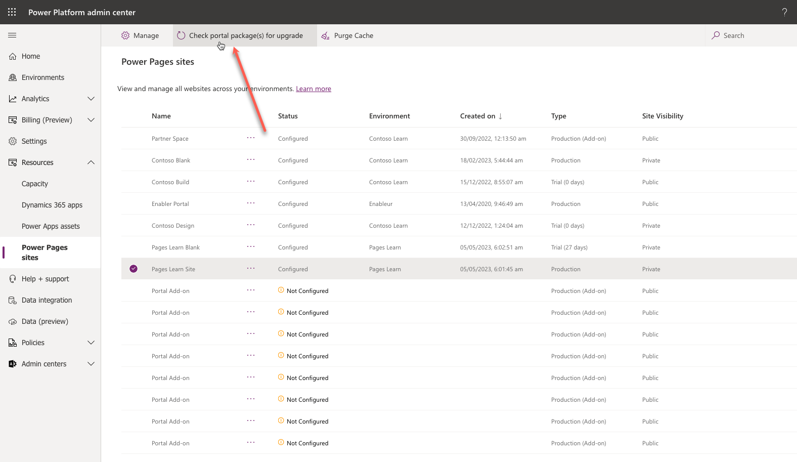 في الجزء الأيمن، قم بتوسيع الموارد ثم حدّد مواقع Power Pages.