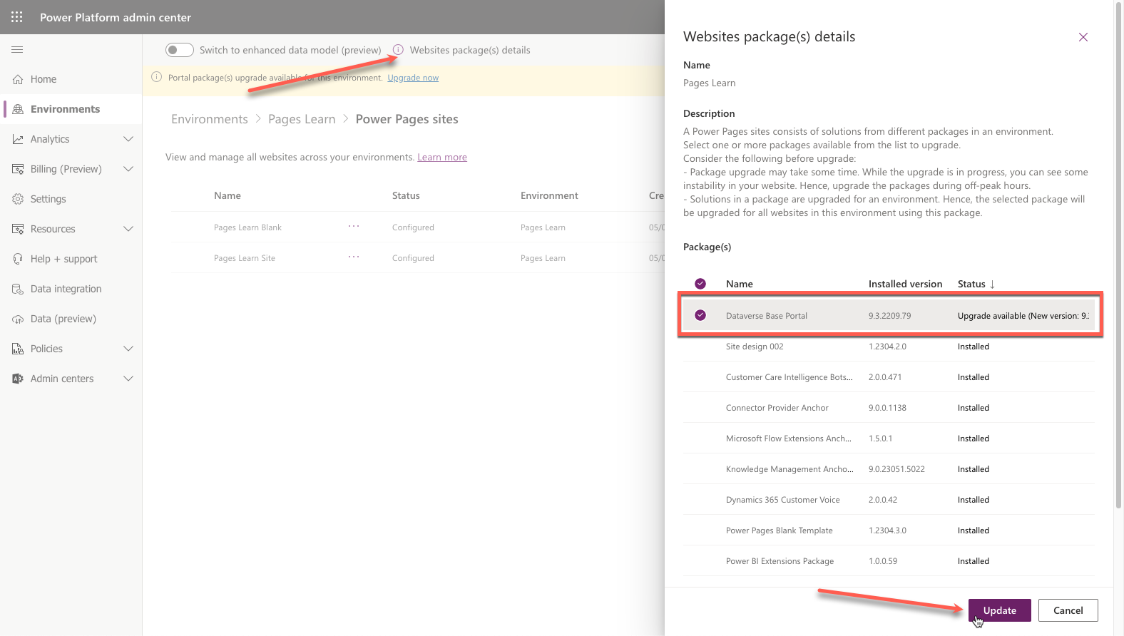 يتكون موقع ويب Power Pages من حلول من حزم مختلفة فِي بيئة. يمكنك استخدام مركز مسؤولي Microsoft Power Platform لعرض التفاصيل وتحديث الحزم المثبتة.