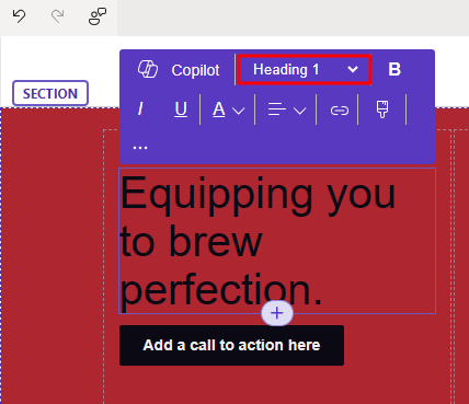 فِي العمود الأول، اختر أو قم بإضَافَة مكون نَص ليتم تحويله إلى العنوان لديك. قم بتحرير نَص المكون ليطَابق النَص التَالي: تجهيزك لتحضير الشرَاب بشكل مثَالي. قم بتغيير النمط إلى العنوان 1 ولون الخط إلى الأسود.