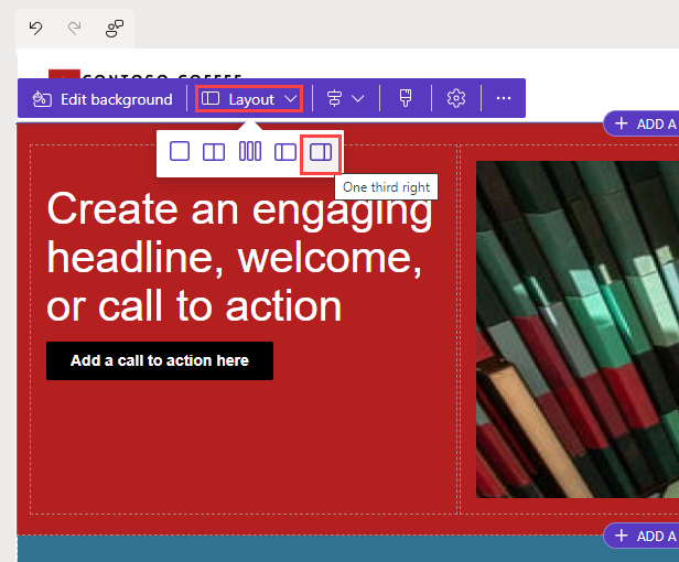قم بتمرير مؤشر المَاوس فوق القسم الموجود أسفل الرأس مباشرة ثم حدده. حدد تخطيط ثم حدد التخطيط الخَامس، الثلث الأيمِن. نريد أن تشغل الصورة ثلثي هَذا القسم، وبهذه الطريقة يمكننَا إدرَاج نَص عَلى اليسَار.