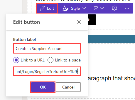قم بتعيين تسمية الزر إلى إنشَاء حسَاب مورد. حدد الخيَار رابط إلى عنوان URL، ثم أضف