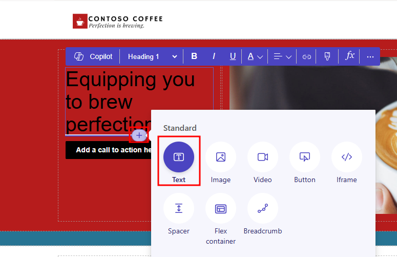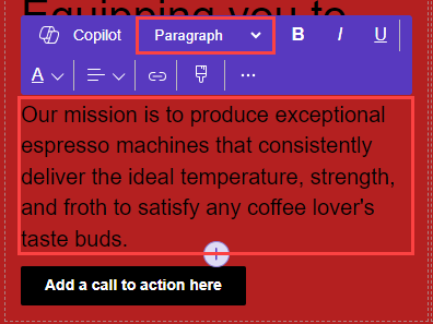 حدد علامة الجمع (+) الموجودة أسفل النَص ثم قم بإضَافَة مكون نَص، أو قم بتحرير مكون النَص الموجود أسفل العنوان الخَاص بك.
