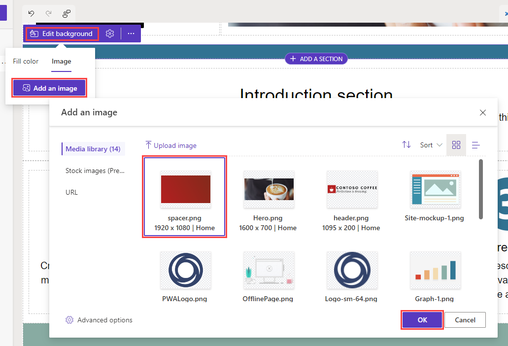 حدد الصورة فِي العمود الثَاني، ثم حدد صورة > تحميل صورة. استعرض للوصول إلى مجلد صور موقع CC فِي ملفات الطلبة لديك، وقم بتحميل hero.png