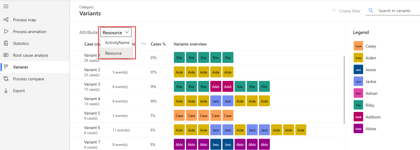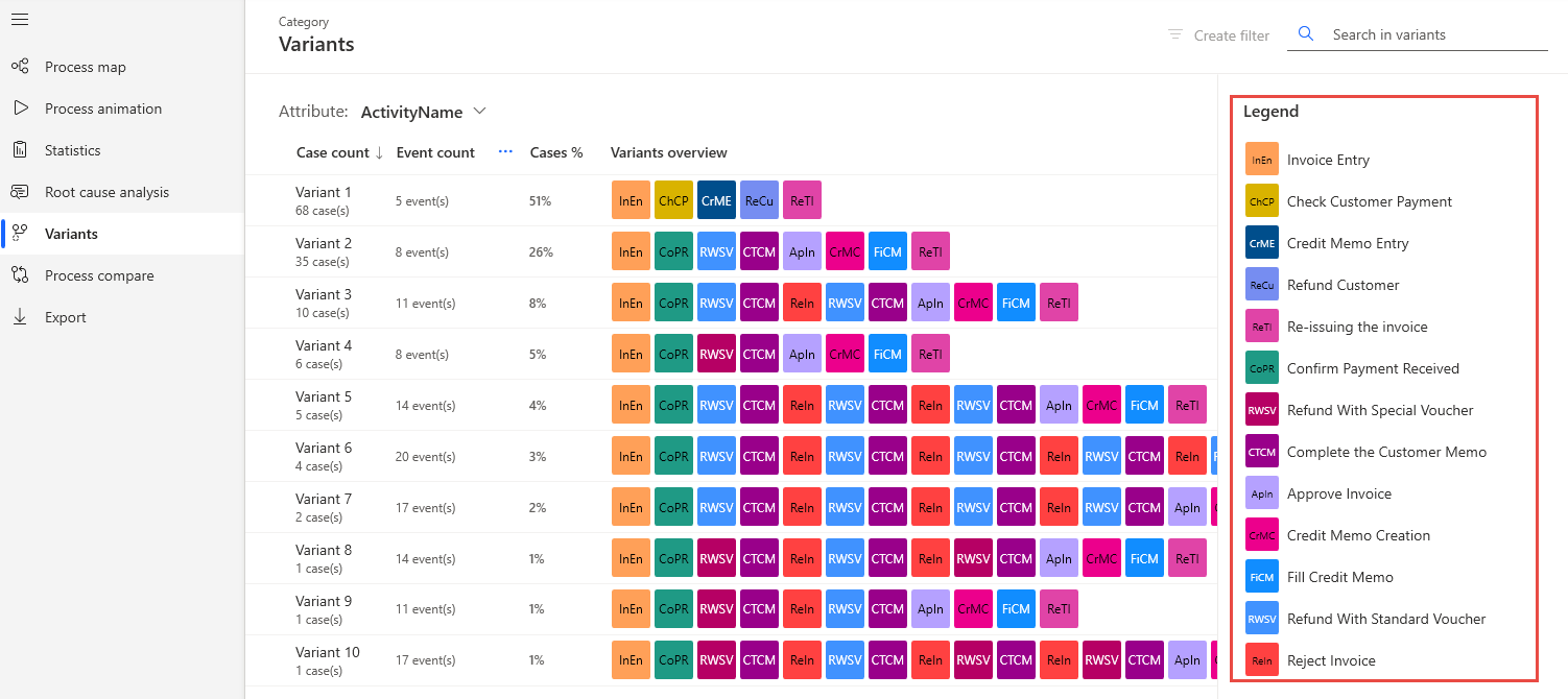 من وحدة المتغيرات، يمكنك مراجعة قائمة المتغيرات التي تم فرزها حسب أعلى عدد مِن الحالات. تعرض القائمة خطوات العملية الأكثر شيوعًا مع عدد الأحداث والنسب المئوية للحالات. يتم ترميز كل خطوة بالألوان مع اختصار الاسم، وهي تتوافق مع وسيلة الإيضاح الموجودة عَلى اليمين والتي تحتوي عَلى الاسم الكامل.