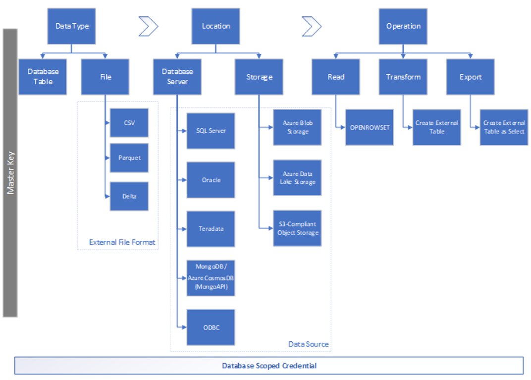 على الرغم من تمكين ميزة PolyBase على مستوى مثيل SQL Server، تعمل كائنات وعوامل تشغيل PolyBase مثل OPENROWSET وCET وCETAS على مستوى قاعدة البيانات. يرتبط كل مصدر بيانات وتنسيق ملف خارجي وبيانات اعتماد خارجية بقاعدة بيانات معينة.