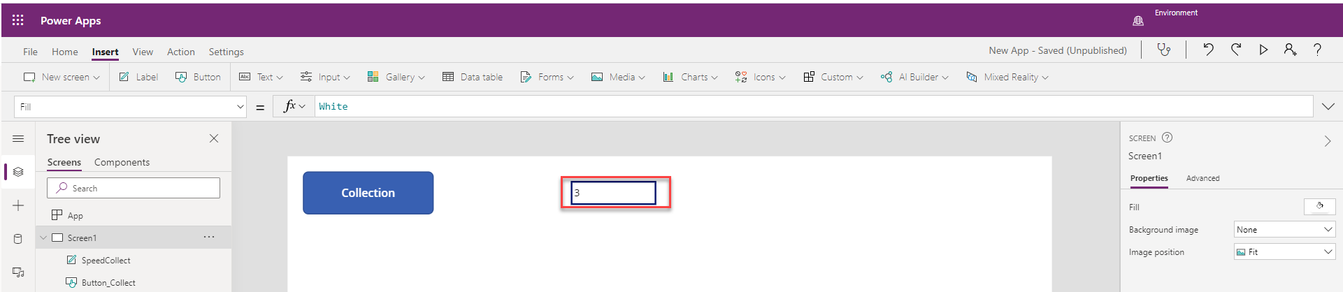 "Collection"وقم بتعيين خاصية OnSelect لهذه الصيغة:Set(varStart,Now()); ClearCollect(colFruit, {Name: "banana", Category: "fruit",AvgCost: .49}, {Name: "peach", Category: "fruit",AvgCost: 1.12}, {Name: "strawberry", Category: "fruit",AvgCost: 2.99}, {Name: "apple", Category: "fruit",AvgCost: 0.98}, {Name: "orange", Category: "fruit",AvgCost: 1.49}, {Name: "pear", Category: "fruit",AvgCost: 0.97}, {Name: "cantaloupe", Category: "fruit",AvgCost: 3.99}, {Name: "pineapple", Category: "fruit",AvgCost: 2.49}, {Name: "cherry", Category: "fruit",AvgCost: 4.99}, {Name: "mango", Category: "fruit",AvgCost: .99} ); ClearCollect(colVegetable, {Name: "carrot", Category: "vegetable",AvgCost: .95}, {Name: "lettuce", Category: "vegetable",AvgCost: 1.69}, {Name: "potato", Category: "vegetable",AvgCost: 5.14}, {Name: "zuccini", Category: "vegetable",AvgCost: 1.99}, {Name: "broccoli", Category: "vegetable",AvgCost: 1.49}, {Name: "cabbage", Category: "vegetable",AvgCost: 2.48}, {Name: "celery", Category: "vegetable",AvgCost: 1.65}, {Name: "asparagus", Category: "vegetable",AvgCost: 2.99}, {Name: "kale", Category: "vegetable",AvgCost: 1.99}, {Name: "cauliflower", Category: "vegetable",AvgCost: 3.24}); Set(varSpeedCollect, Text(DateDiff(varStart, Now(), TimeUnit.Milliseconds)));إدراج تسمية النص، وتعيين خاصية BorderThickness إلى 3، وأعد تسميتها إلى lblSpeedCollect، وتعيين خاصية Text إلى: