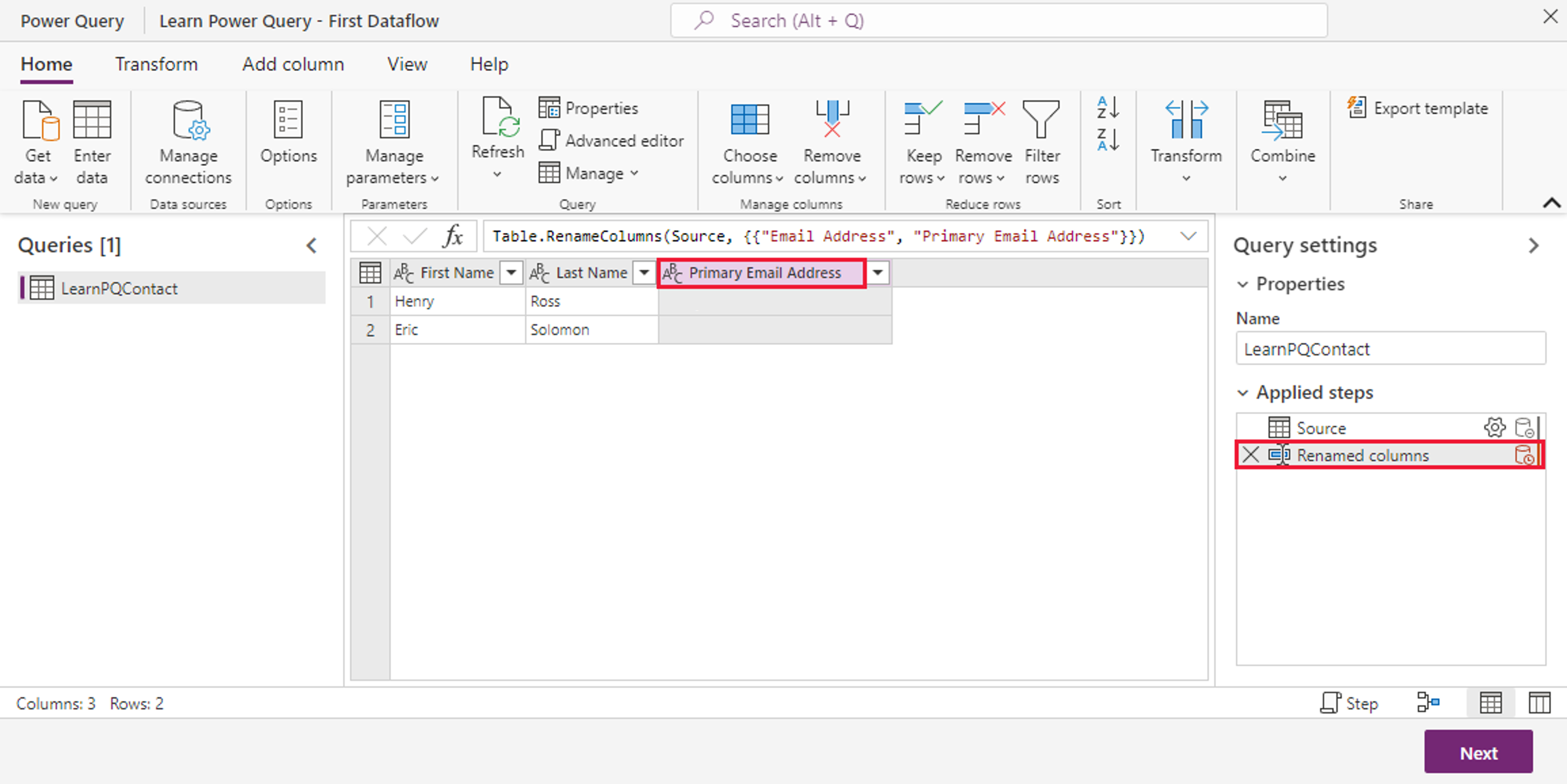 تتيح لك خطوة تحويل البيانات العديد من الخيارات لتحويل البيانات، مثل إضافة أعمدة بناءً على العمليات الحسابية أو التجميعات أو تحويل أعمدة أخرى لمصدر البيانات. يمكنك أيضاً الإزالة وإعادة التسمية والفرز والعديد من الخيارات الأخرى. انقر نقراً مزدوجاً فوق عمود Email Address فِي بياناتك وأعد تسميته باسم Primary Email Address. لاحظ كيف أنه فِي جزء إعدادات الاستعلام على اليمين، ضمن الخطوات التطبيقية يتم سرد الخطوة التي قمت بها للتو والتي تسمى الأعمدة المعاد تسميتها.