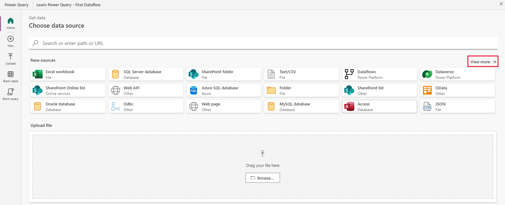 من نافذة اختيار مصدر البيانات فِي Power Query، حدّد مصدر البيانات لسيناريو عملك. وهناك العديد من المصادر المختلفة للاختيار من بينها، ويمكنك تحميلها بسهولة من جهاز الكمبيوتر الخاص بك لبدء العملية. على سبيل المثال، سنقوم بإنشاء جدول فارغ. للعثور على هذا الخيار، حدّد عرض المزيد من أعلى يمين قائمة المصادر، ثم قم بتحديد جدول فارغ. يوجد خيار الجدول الفارغ بالقرب من الصف السفلي بقائمة المصادر الخاصة بك.