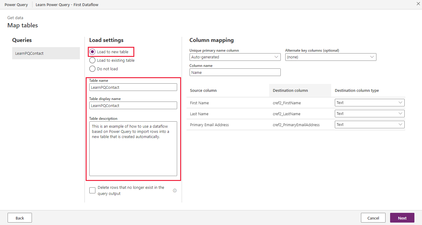 توفر لك شاشة تعيين الجداول طريقة لتحديد ما إذا كنت تريد إنشاء جدول جديد أو تحديث جدول موجود. بشكل افتراضي، يقوم Power Apps بتحديد الخيار التحميل إلى جدول جديد. وبعد ذلك، تقوم بتحديد عمود الوجهة لكل عمود مصدر أثناء استيراد البيانات. بالنسبة للسيناريو الحالي، إذا قمت بإدخال اسم جدول فِي خطوة تحويل البيانات، فسيكون لكل من اسم الجدول واسم عرض الجدول بالفعل اسم الجدول الذي قدمته. يمكنك تغيير القيم هنا. انطلق وأدخل وصف الجدول. لا يتطلب تعيين الأعمدة تعديلات، لأننا نقوم بإنشاء جدول جديد استناداً إلى شاشة تحويل البيانات الخاصة بنا. حدّد التالي لإكمال هذه الخطوة.
