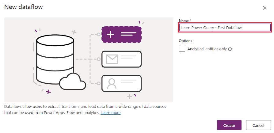 التركيز على خيار قائمة تدفق البيانات الجديدة.في نافذة تدفق البيانات الجديدة، أدخل اسماً لتدفق البيانات الجديد، وبعد ذلك، حدّد إنشاء.