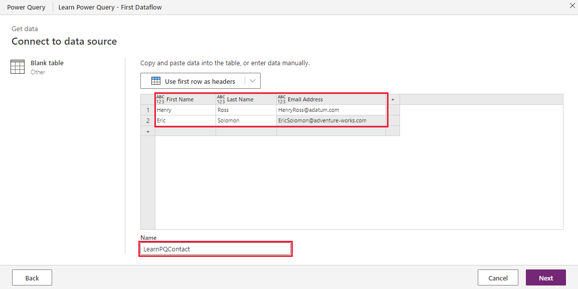 يمكننا إدخال بعض البيانات فِي الجدول، تحت الصفوف التي أنشأناها. يمكننا أيضاً تسمية جدولنا. في هذه الحالة، نسميه "LearnPQContact". حدّد التالي لإكمال هذه الخطوة والانتقال إلى خطوة تحويل البيانات.