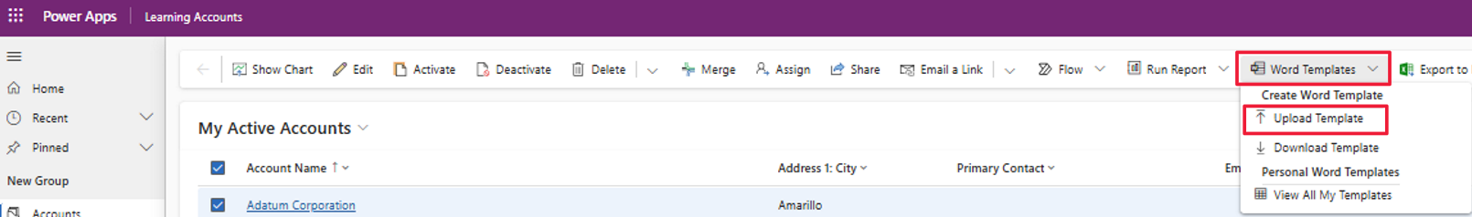 فور أن يصبحَ القَالب المُنسق جَاهزًا للاستخدَام، قُم بحفظِه. بَعد ذلك، قُم بتَحميل الإصدَار المَحفوظ إلى التطبيقِ الذي يستندُ إلى النموذَج مِن خلال الانتقَال إلى نفسِ طريقةِ عَرض الجدول التي استخدمتهَا مسبقًا لتنزيل قَالب Word. فور الدُخُول إلى طريقةِ العَرض الصَحيحَة، حدد سجلاً محددًا. ثُمَّ مِن القَائمة المِنسدلة قوَالب Word، حدد تحميل قَالب.