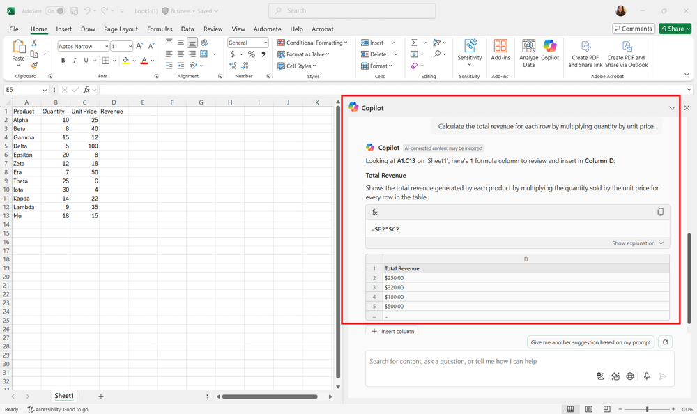 على سبيل المثال، ضع في اعتبارك مجموعة بيانات من حركات المبيعات مع أعمدة للمنتج والكمية وسعر الوحدة والإيرادات. بدلا من كتابة صيغة يدويا للإيرادات ك = QuantityUnitPrice * وسحبها لأسفل آلاف الصفوف ، يمكنك أن تطلب من Copilot Chat: