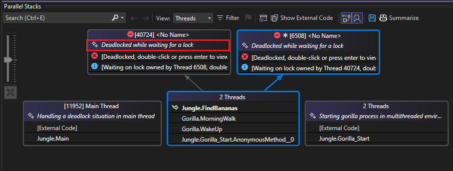 FindBananasis deadlocked. The execution pointer inFindBananasis a curled green arrow, indicating the current debugger context but also it tells us that the threads are not currently running.Note