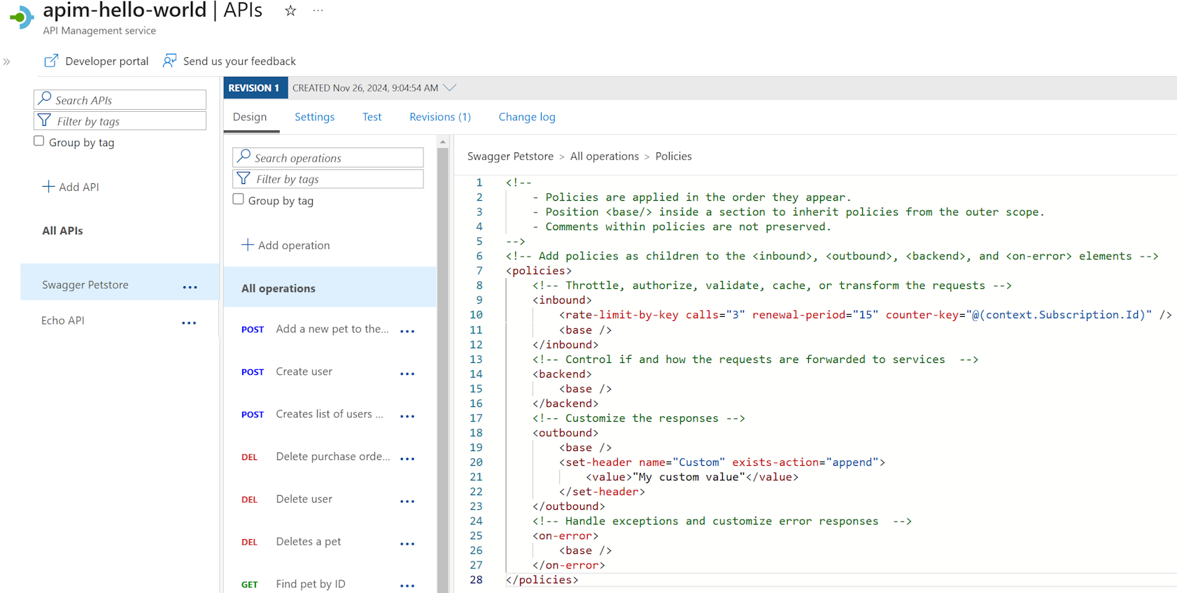 For example, you might want to set a custom response header. Or, configure a rate limit policy to protect your backend API, so developers don't overuse the API. These examples are a simple introduction to API Management policies. For more policy options, see API Management policies.