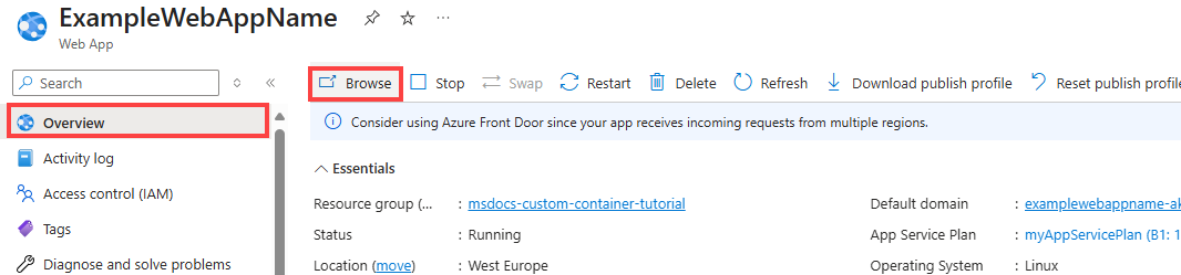 az webapp log tail --name <app-name> --resource-group msdocs-custom-container-tutorialIf you don't see console logs immediately, check again in 30 seconds.
