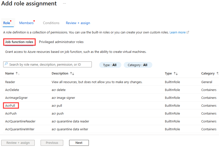 az role assignment create --assignee $principalId --scope $registryId --role "AcrPull"For more information about these permissions, see What is Azure role-based access control?.