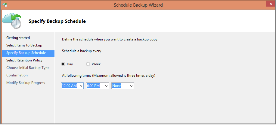 On the Specify Backup Schedule page, specify when to take daily or weekly backups. Then select Next.