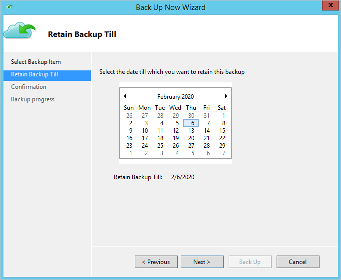 If the MARS agent version is 2.0.9169.0 or newer, set a custom retention date. In the Retain Backup Till section, choose a date from the calendar.
