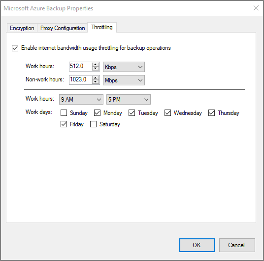 On the Throttling tab, select Enable internet bandwidth usage throttling for backup operations.