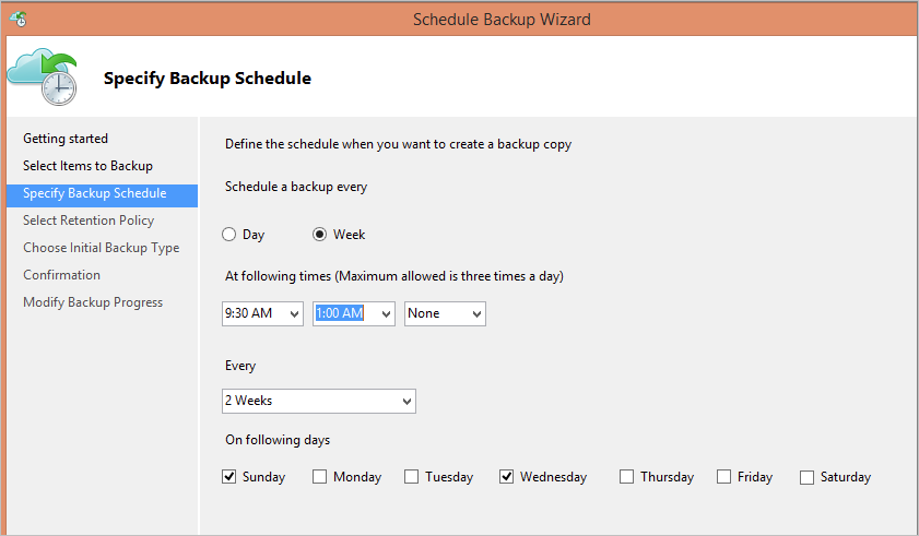 You can run weekly backups too. In the following example, backups are taken every alternate Sunday and Wednesday at 9:30 AM and 1:00 AM.