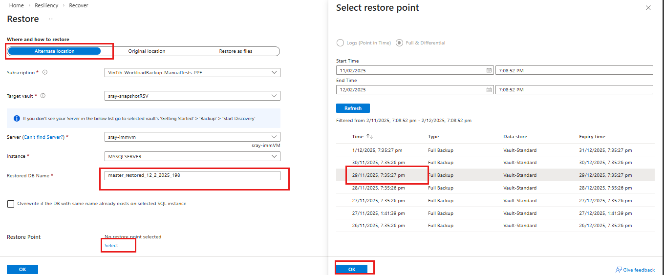 - Restore to a specific date or time (to the second) by using transaction log backups. Azure Backup automatically determines the appropriate full differential backup and the chain of log backups that are required to restore based on the selected time.