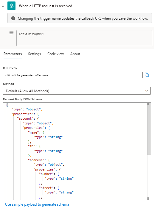 Property name JSON property name Required Description HTTP URL {none} Yes The endpoint URL that's generated after you save your workflow and is used for sending a request that triggers your workflow. Request Body JSON Schema schemaNo The JSON schema that describes the properties and values in the incoming request body. The designer uses this schema to generate tokens for the properties in the request. That way, your workflow can parse, consume, and pass along outputs from the Request trigger into your workflow.