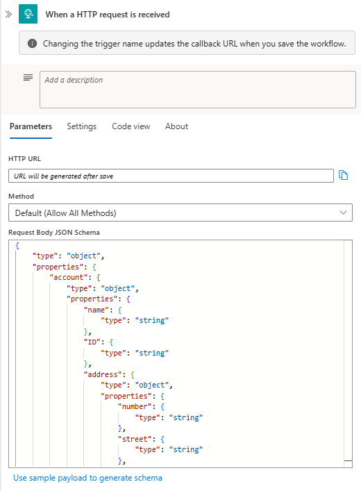 { "type": "object", "properties": { "account": { "type": "object", "properties": { "name": { "type": "string" }, "ID": { "type": "string" }, "address": { "type": "object", "properties": { "number": { "type": "string" }, "street": { "type": "string" }, "city": { "type": "string" }, "state": { "type": "string" }, "country": { "type": "string" }, "postalCode": { "type": "string" } } } } } } }When you enter a JSON schema, the designer might show a reminder to include the