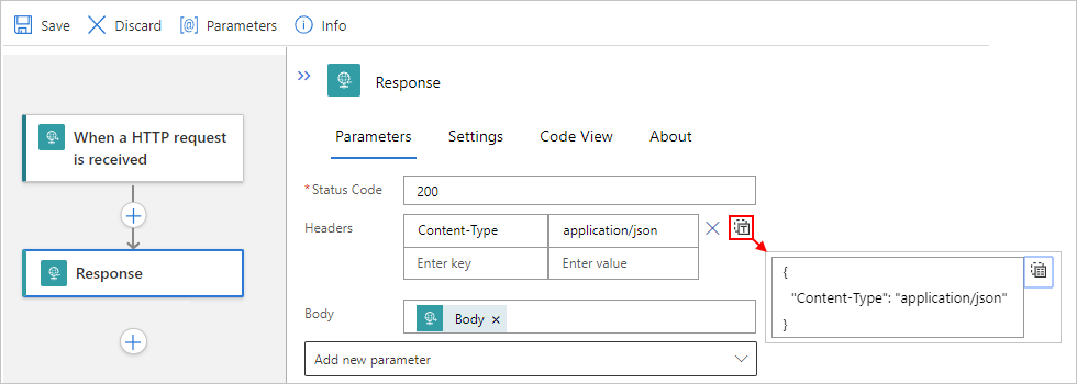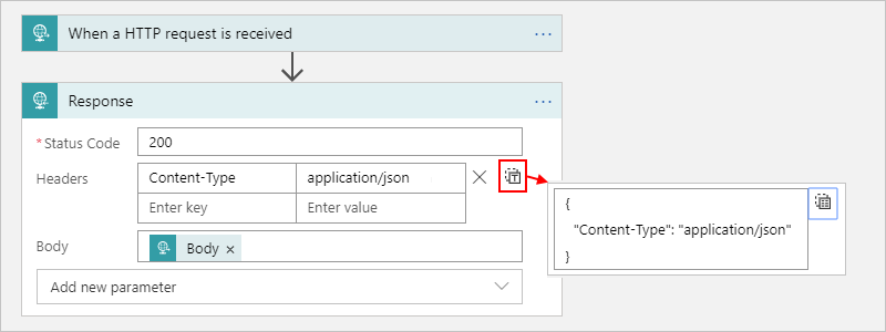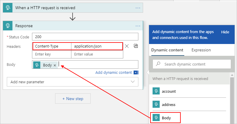 Property name JSON property name Required Description Status Code statusCodeYes The status code to return in the response Headers headersNo A JSON object that describes one or more headers to include in the response Body bodyNo The response body When you select inside any text fields, you get the options to open the dynamic content list (lightning icon) or the expression editor (function icon). When you choose the dynamic content list, you can select outputs that are available from earlier steps in the workflow. If you specified a schema in the Request trigger, the schema properties also appear in the dynamic content list and are available for you to use in your workflow.