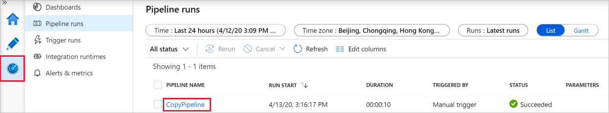 Go to the Monitor tab on the left. You see a pipeline run that is triggered by a manual trigger. You can use links under the PIPELINE NAME column to view activity details and to rerun the pipeline.