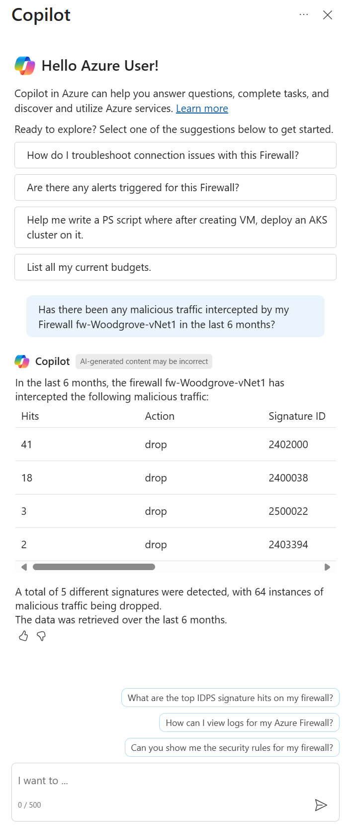 There are many prompts you can use to get information from Azure Firewall. This section lists the ones that work best today. They're continuously updated as new capabilities are launched.