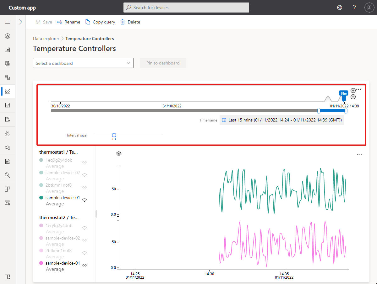 Group by: The Group by control helps to group the data by using the device properties as dimensions. Device telemetry and properties are combined with cloud properties when the device sends data. If the cloud or device property is updated, then you see the telemetry grouped by different values on the chart.