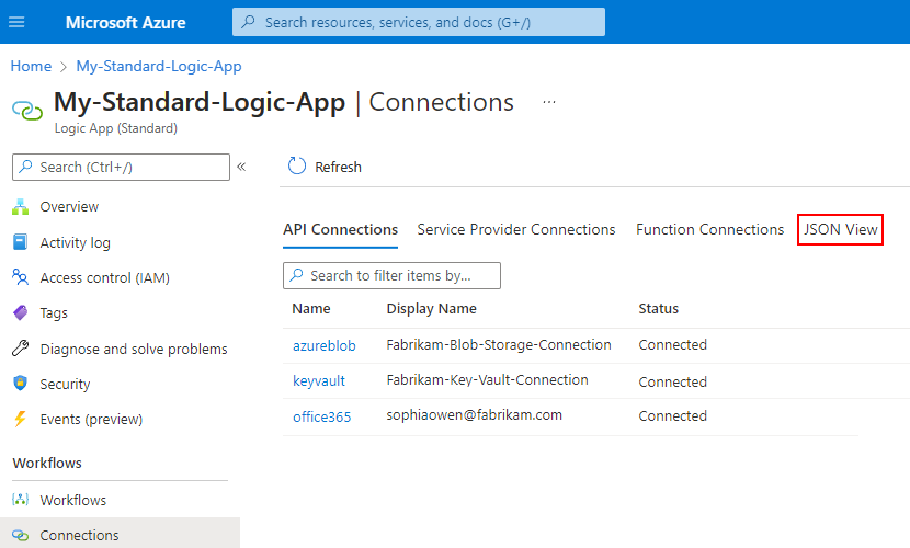 Screenshot showing the Azure portal, Standard logic app resource, Connections pane with JSON View selected.