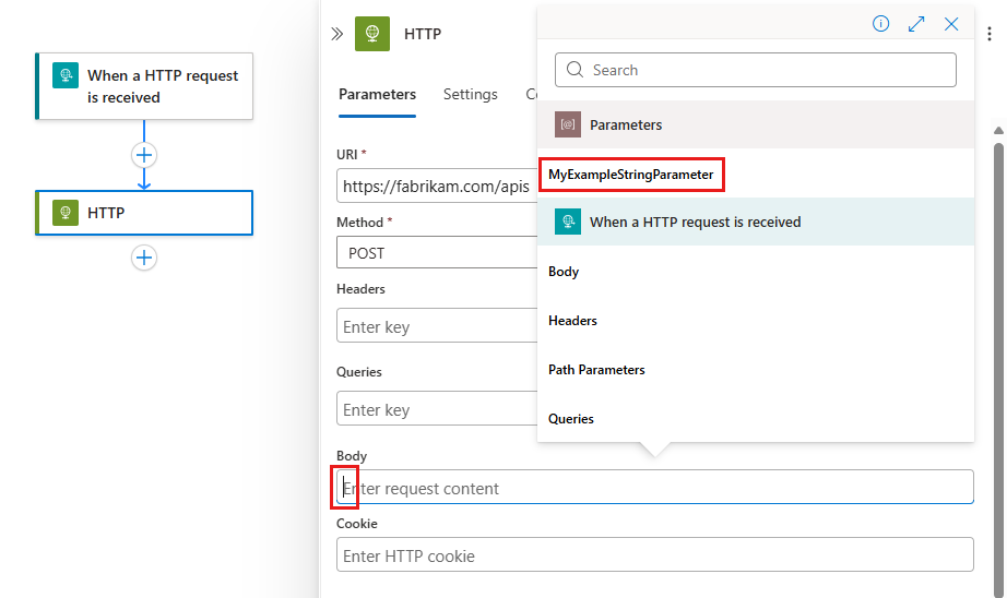 In the information pane, on the Parameters tab, in the property where you want to use the parameter, select inside that property's edit box. Select the lightning icon to open the dynamic content list.