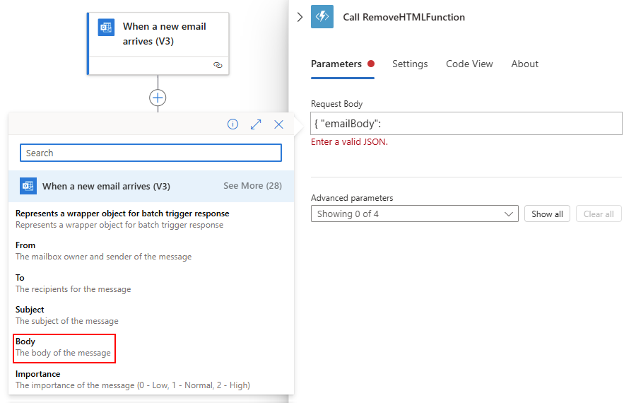 The following steps create an Azure function in C# that removes HTML from each incoming email by using the sample code snippet. This function makes the email content cleaner and easier to process. You can call this function from your workflow.