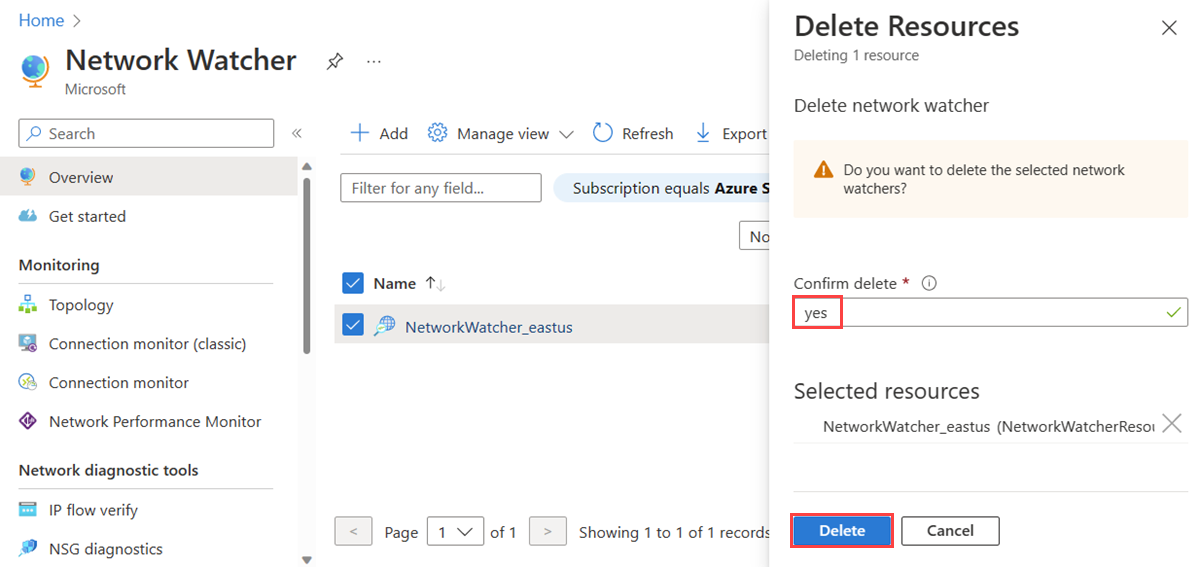 Screenshot shows how to delete a Network Watcher instance in the Azure portal.