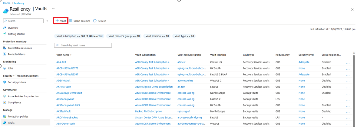 Ensure you have a Recovery services vault created to proceed with the flow for Azure Backup or Azure Site Recovery. You can create a vault from Vaults view in Resiliency: