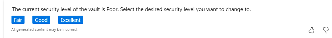 In the following screenshot, Copilot shows the vault's current security level and suggests the next level (Poor to Fair, Fair to Good, or Good to Excellent) along with recommended steps to upgrade it.